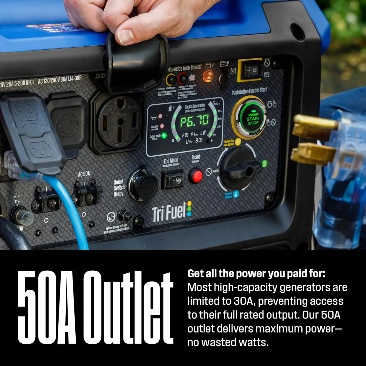 - TRANSFER SWITCH OR INTERLOCK KIT READY: Features one 120/240V 14–50R 50A outlet for home or RV and one 120V/240 L14-30R 30A twist lock, both outlets are transfer switch or interlock kit ready for home backup; includes one GFCI 120V 5–20R 20A duplex household outlet; all have rubber covers
