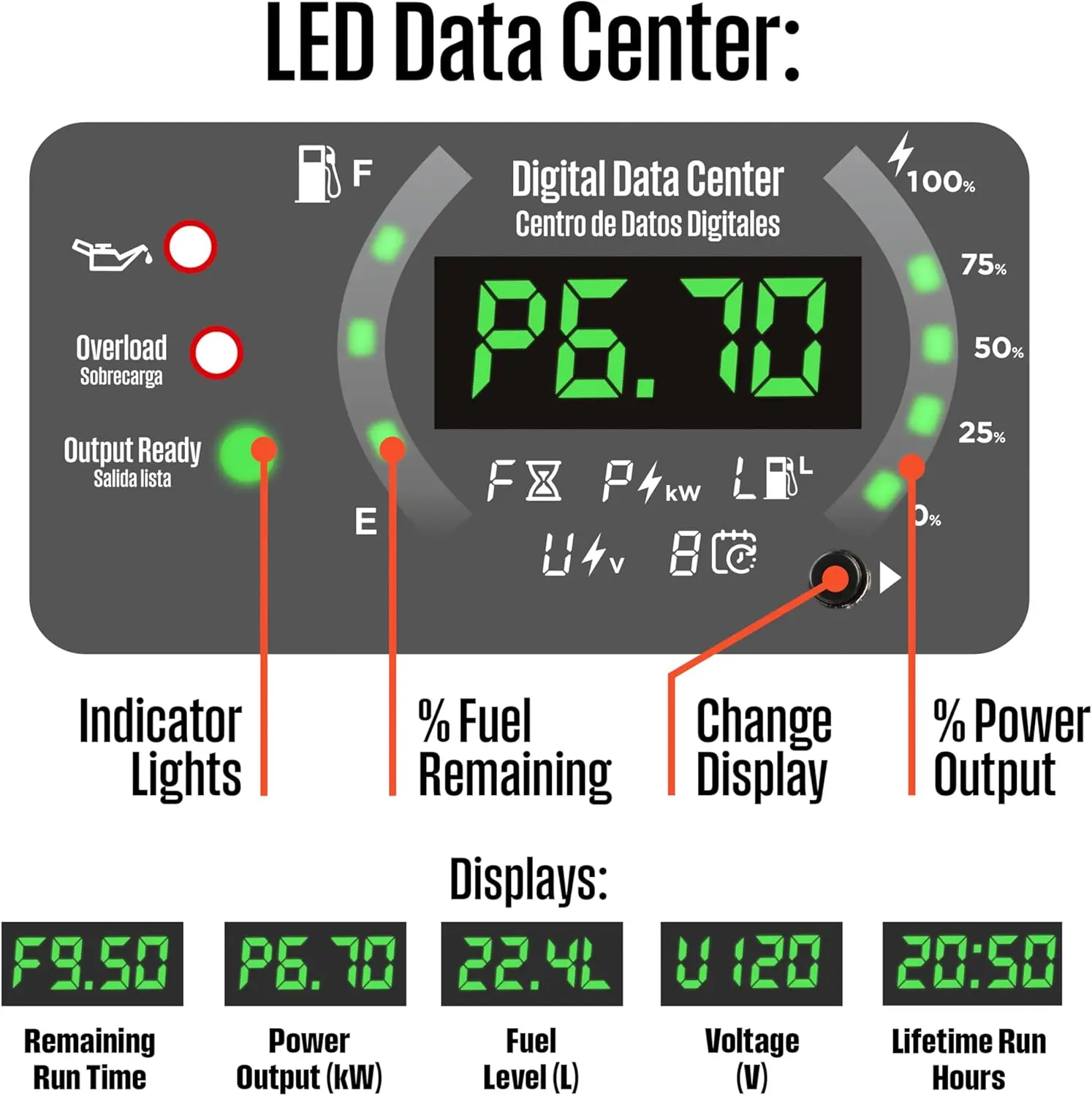 - LED DATA CENTER: Digital display shows fuel level, power output, remaining run time, voltage output, and lifetime hours, taking the guesswork out of operation; also comes with a remote start key fob, LI battery, 12V battery charger, oil with funnel, and tool kit to get you going out of the box