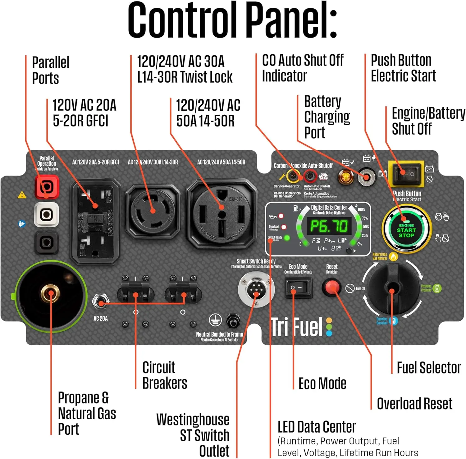 | Special Feature | Digital Display, Electric Start, Overload Protection, Flat-Free Tire, Hour Meter, Tri-Fuel, Heavy Duty, Remote Start, Fuel Gauge, CO Sensor, Fully Enclosed DesignDigital Display, Electric Start, Overload Protection, Flat-Free Tire, Hour Meter, Tri-Fuel, Heavy Duty, Remote Start, Fuel Gauge, CO Sensor, Fully Enclosed Design |